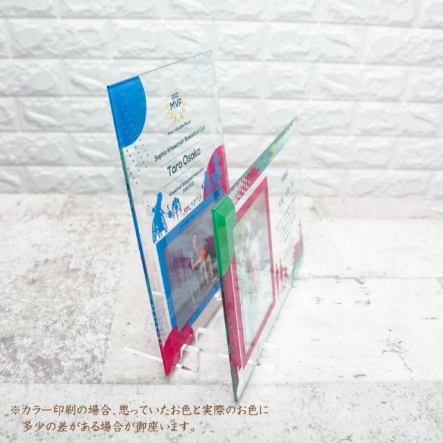淡いグリーンのガラス越しに背景デザインが見える、パラスポーツ ガラスフォトフレームです。派手になりすぎず落ち着いた仕上がりは、どんなインテリアにも合わせることができます。