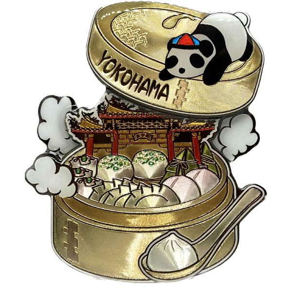 中華帽をかぶった可愛いパンダや派手な中華門、美味しそうな中華まん、焼売、ギョウザなど中華街らしさがいっぱいです。