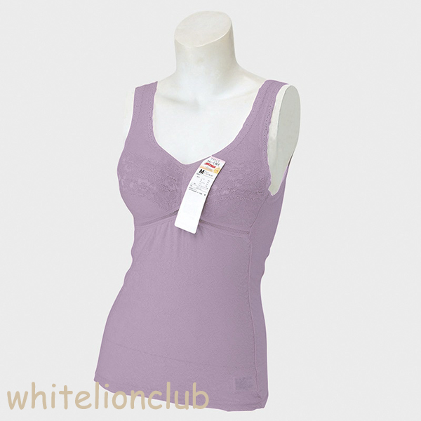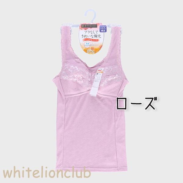 ブラなしでキレイな胸元。シルク入り綿混ブラキャミソール。美しいレースのバストライン。アンダーメッシュで通気性がありムレにくい。肌触りの良いインナーです。