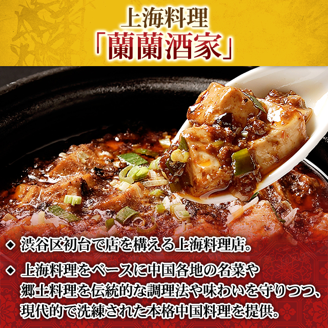 商品名 蘭蘭酒家 四川麻婆豆腐 150g×5袋 容量 150g×5袋 原材料名 豆腐{大豆(国産)、でん粉}、ねぎ油(国内製造)、紹興酒(中国製造)、豚肉(アメリカ産)、トウチ、ラー油、長ねぎ、豆板醤、にんにく、生姜、甜麺醤、ごま油、花椒油、香辣醤、香味油、ポーク・チキンエキス、醤油、唐辛子、辣椒油、香辛料、大豆油/糊料(加工でん粉)、凝固剤(塩化Mg)、調味料(アミノ酸等)、カラメル色素、酸味料、(一部に小麦・大豆・ごま・豚肉・鶏肉を含む) アレルギー特定原材料 小麦 加工地 埼玉県 賞味期限 商品の発送時点で、90日以上あるものをお届けいたします 保存方法 冷凍(-18℃以下)