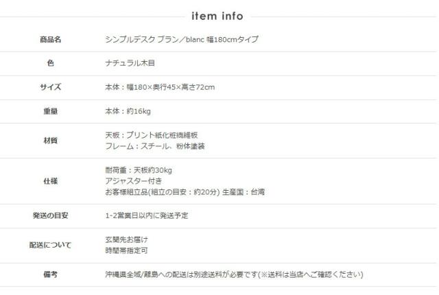 シンプルデスク ブラン/blanc 幅180cmタイプ