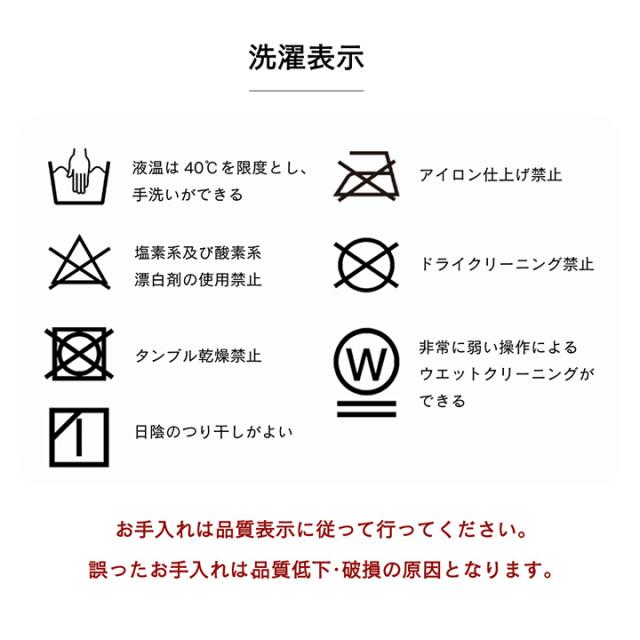 | 洗濯表示 | 40°C以下の水温で弱い手洗いで洗濯してください。 (洗濯機は使用できません。) 干し方=日陰のつり干しがよい。 |