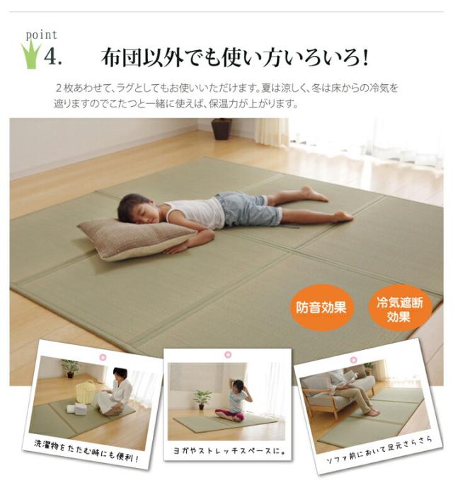 | ■マットレスとして使用できるユニット畳です。 ■布団の下に敷いても使用していただけるように、布団のサイズに合わせました。 ■布団を上げれば、簡易的な和室やお子様が遊べるスペースとしてもご使用いただけます。 ■い草には空気の自然浄化作用、湿度の調節作用などがあります。布団の下の湿度を調湿してくれます。 ※自然素材につきい草部分の商品仕様が異なる場合があります。 | |