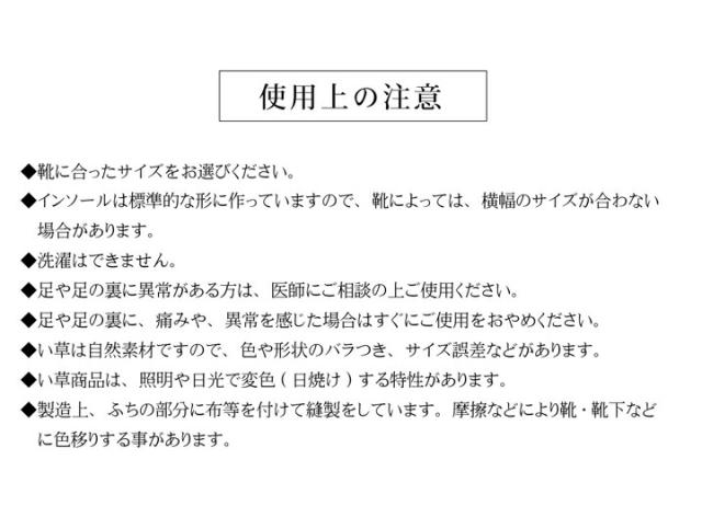 ■い草を使用したインソールです。い草の消臭効果・湿度調整機能で、蒸れを抑え、臭いを消臭する効果があります。 ■革靴やスニーカーなどにもおすすめです。 ■サイズは17cmから32cmまでご用意しています。 ※ 掲載写真は表記サイズと異なる場合がございます。 ※ 画面上のカラーはご使用ブラウザやモニターの設定により、実物とは若干異なる場合がございます。あらかじめご了承の上、ご注文をお願いいたします。 | |