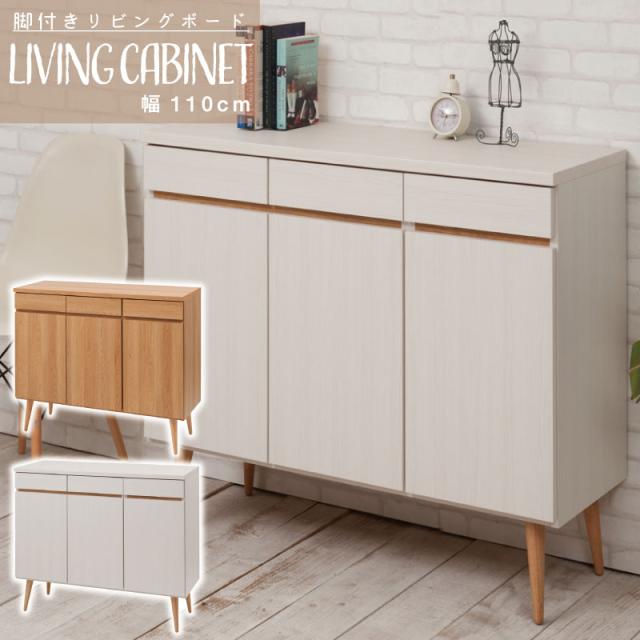 脚付きキャビネット 幅110 ナチュラル ホワイト リビングキャビネット 完成品 日本製 国産 チェスト ラック 収納棚 新生活 FAX台 ダイニング リビング 玄関 窓下 寝室 子供部屋 収納 北欧 おしゃれ 脚付き両開き 扉付き 引出付き 隠す収納