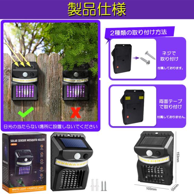 【多機能センサーライト】照明効果だけではなく、電撃殺虫器としても使えるセンサーライトです。26個LEDライトが搭載し、明るさは抜群で、バルコニー、廊下、パティオ、庭園、階段、外壁、ガレージ、歩道に明るく安全な環境を作り出し、より多くの照明エリアを提供して、停電、地震、台風など災害時、アウトドアシーンや緊急時まで、様々な場面でも活躍して優れるものです。光で虫を引き寄せ、電撃ショックで瞬間時に殺虫もできます。蚊・ハエなどを駆除し、快適にお過ごしいただけます。【ソーラー充電式&自動点灯・消灯】センサーライトはソーラーで充電:太陽光の光をエネルギーに変えて使用する仕組みになっていて完全に太陽光発電の為、電気代0、CO2排出0!電気代に負担なく環境に優しいです!光センサーを採用しており暗くなったら自動で点灯し、明るくなると消灯します。毎日のスイッチON・OFFの手間がかかりません。