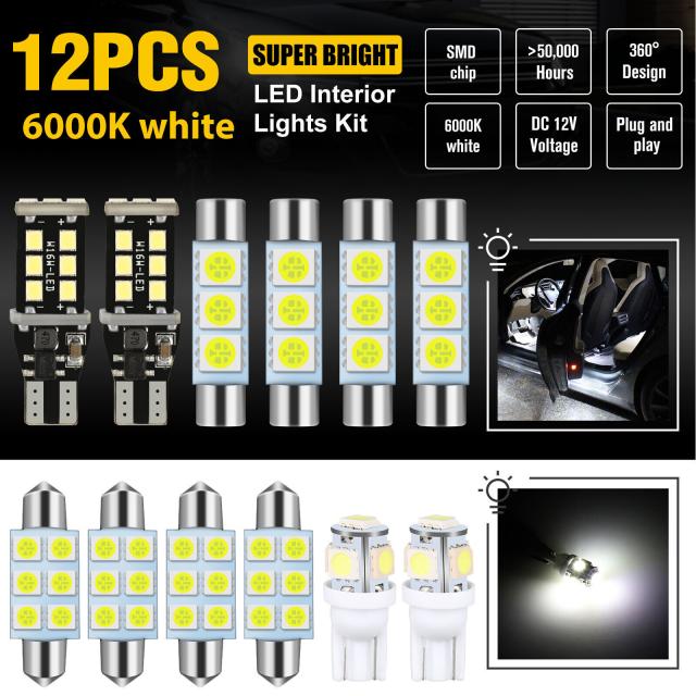 パッケージ: 2x マップ ライト、2x ドーム ライト、4x バニティ ミラー/バイザー ライト、2x ラゲッジ/カーゴ ライト (Canbus)、2x ナンバー プレート ライト (合計 12 個の LED 電球) が含まれます。