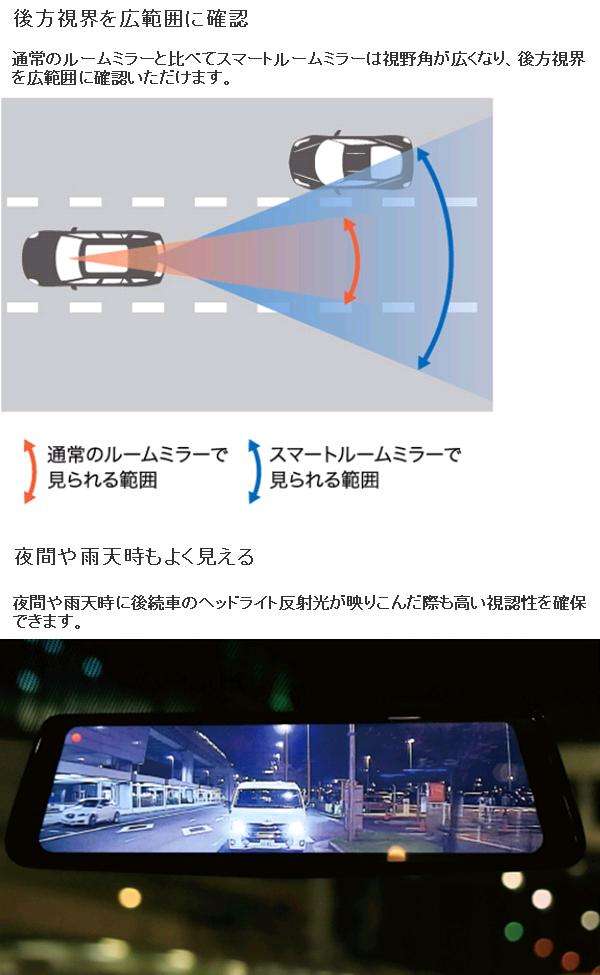 ◇通常のルームミラーと比べてスマートルームミラーは視野角が広くなり、後方視界を広範囲に確認いただけます。