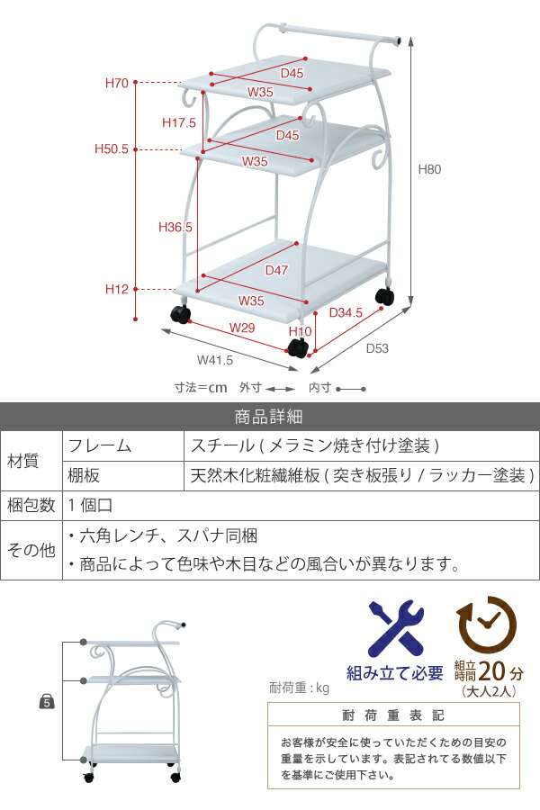 ■IRI-0054-WH アンティーク調キッチンワゴン ホワイト ヨーロッパ伝統工芸【組立式】