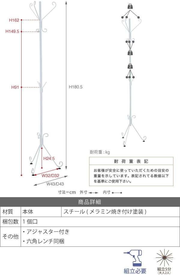 ■IRI-0053-WH アンティーク調ポールハンガー ホワイト ヨーロッパ伝統工芸【組立式】