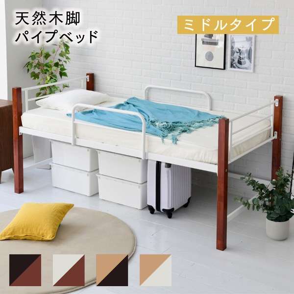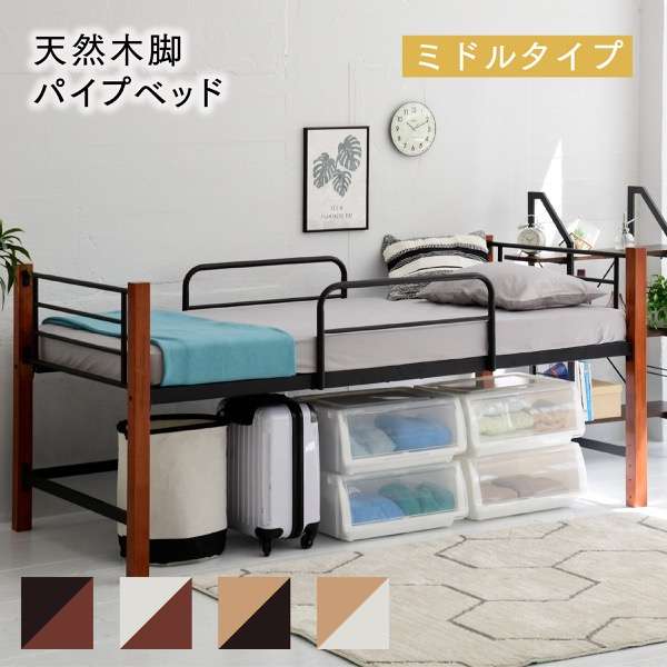 ジェイケイプラン IRI-1041-WHBR シングル ベッド 天然木脚 ミドルベッド スチールベッド パイプベッド ホワイト/ブラウン