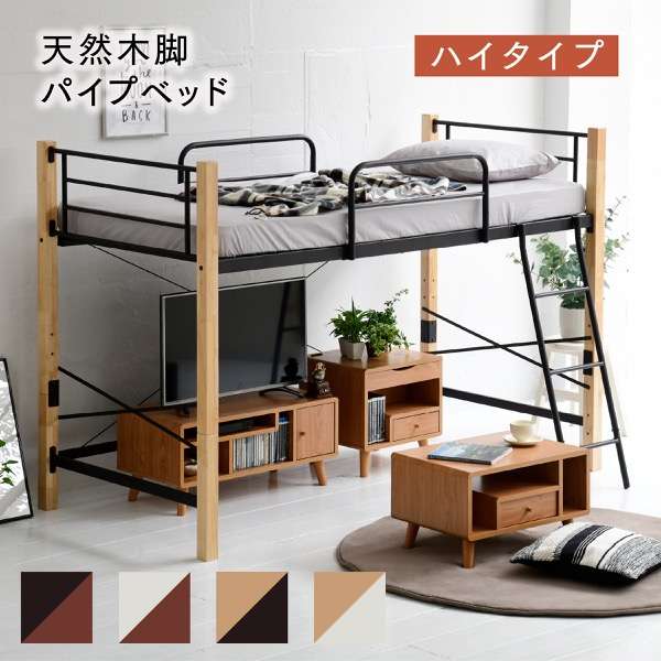 ジェイケイプラン IRI-1043SET-WHBR ロフトベッド 天然木脚 ハイタイプ シングル システム パイプ フレーム ベッド ホワイト/ブラウン