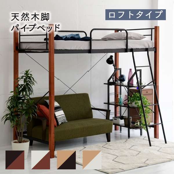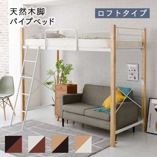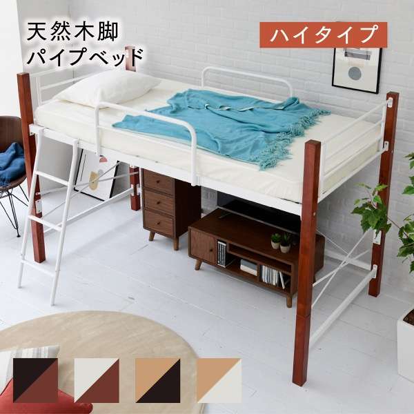 ジェイケイプラン IRI-1043SET-WHNA ロフトベッド 天然木脚 ハイタイプ シングル システム パイプ フレーム ベッド ホワイト/ナチュラル