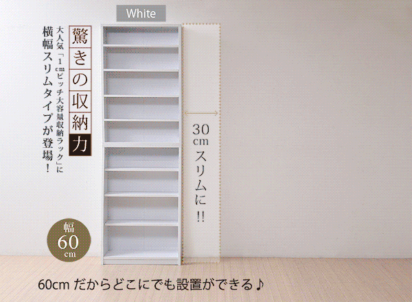 ■JK-PLAN YHK-0214-WH 1cmピッチ 薄型 大容量 文庫本ラック 幅60 本棚 ホワイト