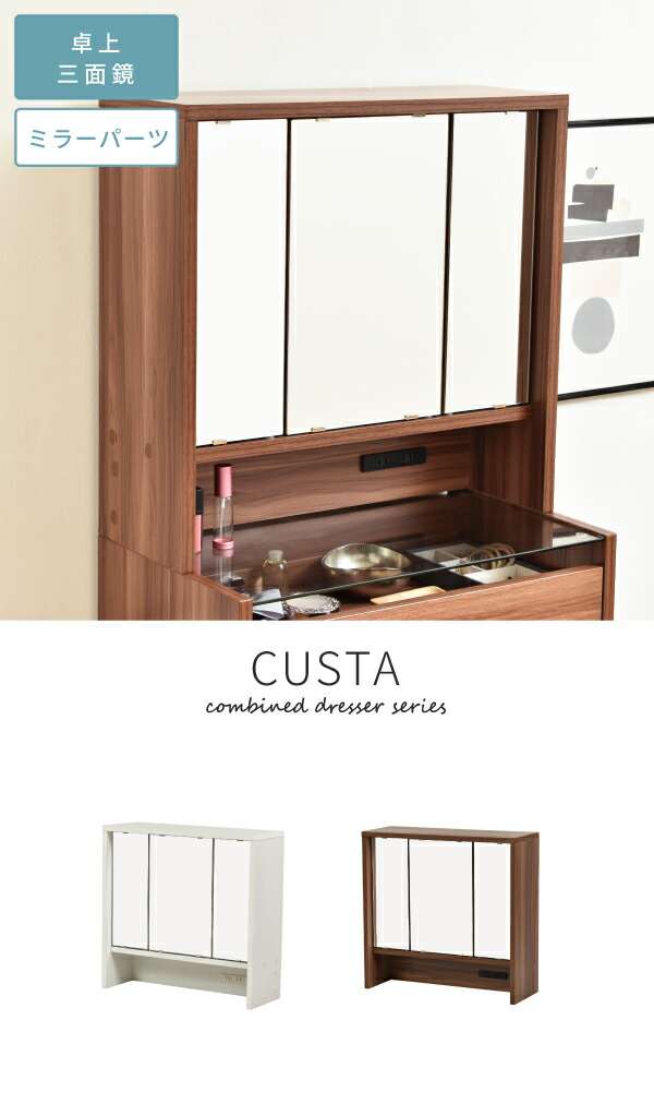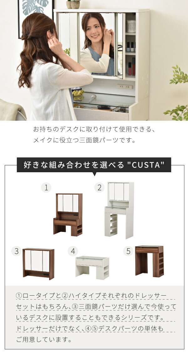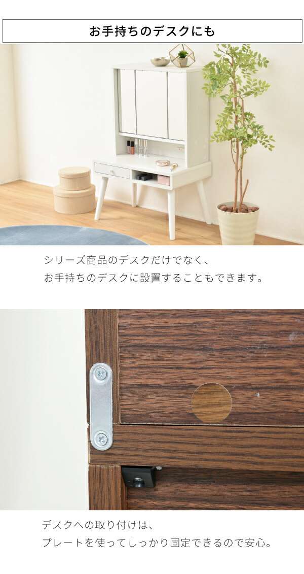 お手持ちのデスクに取り付けて使えるドレッサーパーツ。メイクやヘアアレンジの際に役立つ三面鏡タイプです。ミラーの中には高さを調節できる棚がついているので、メイクグッズやボトル、スプレーなどもまとめて収納できます。