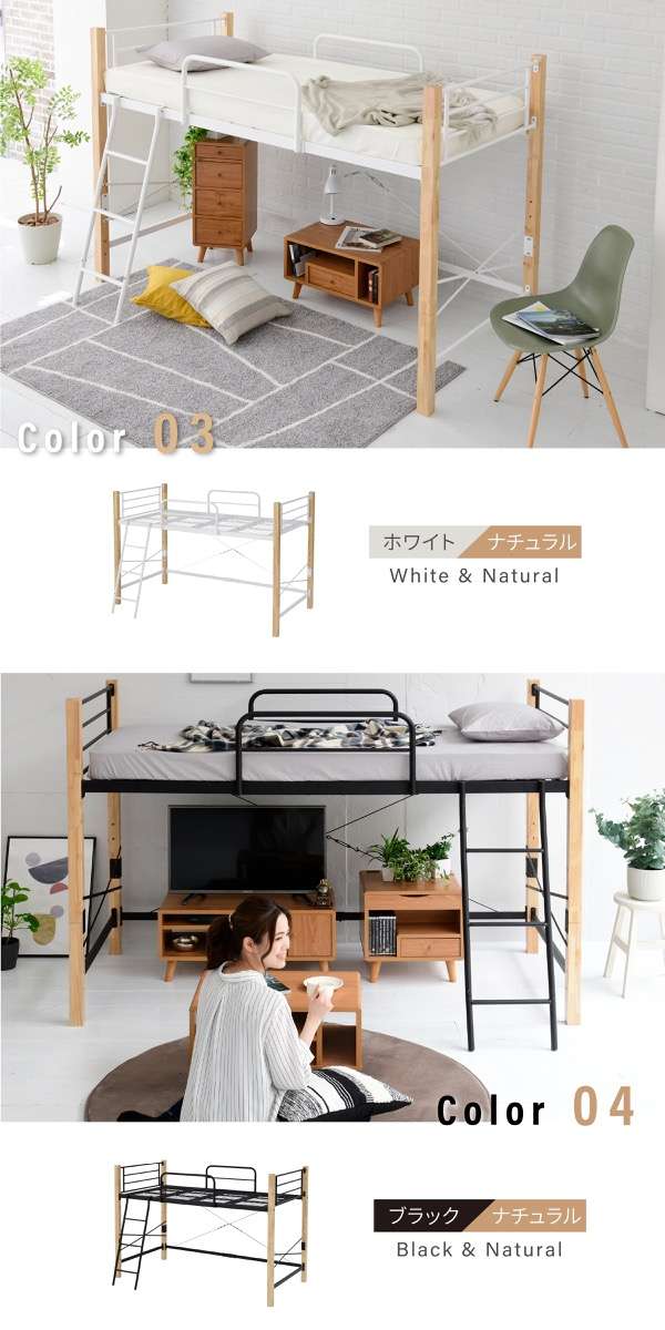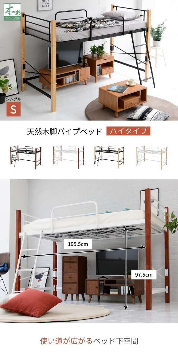 ジェイケイプラン IRI-1043SET-WHNA ロフトベッド 天然木脚 ハイタイプ シングル システム パイプ フレーム ベッド ホワイト/ナチュラル