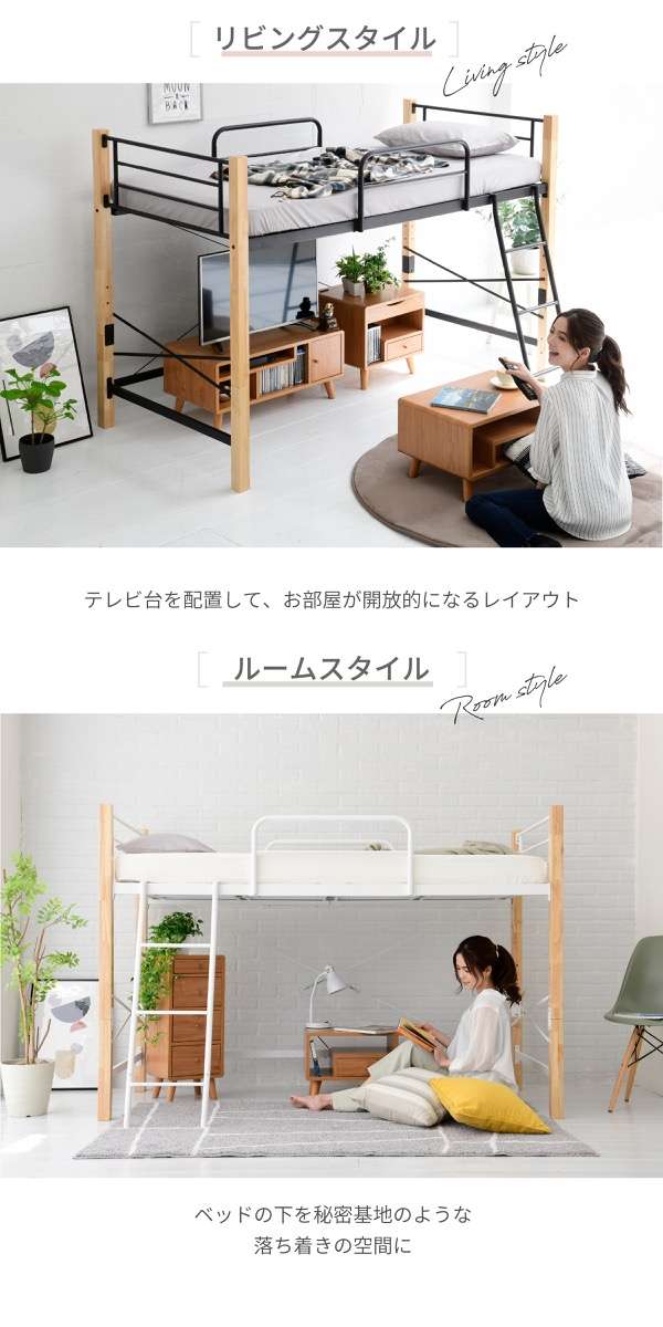 ジェイケイプラン IRI-1043SET-BKNA ロフトベッド 天然木脚 ハイタイプ シングル システム パイプ フレーム ベッド ブラック/ナチュラル
