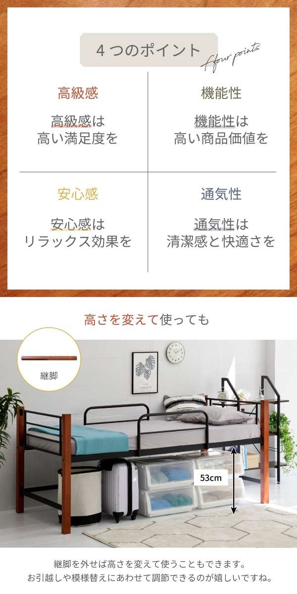 ジェイケイプラン IRI-1041-BKBR シングル ベッド 天然木脚 ミドルベッド スチールベッド パイプベッド ブラック/ブラウン