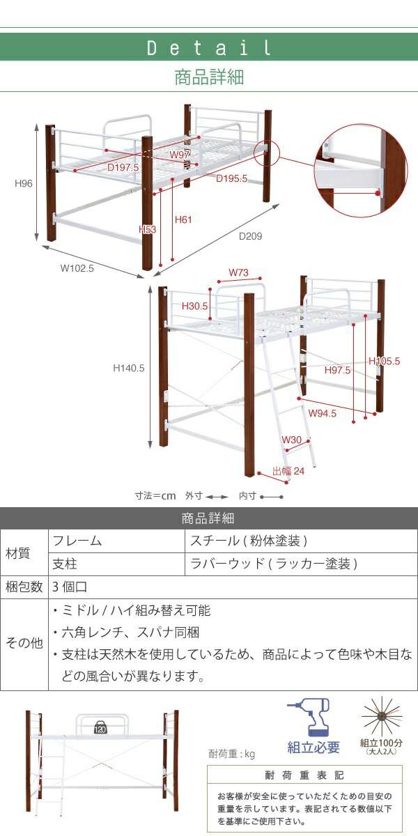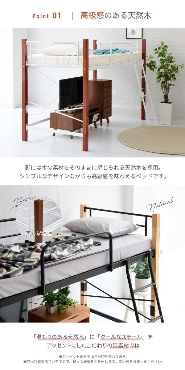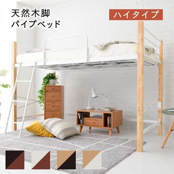 ジェイケイプラン IRI-1043SET-WHBR ロフトベッド 天然木脚 ハイタイプ シングル システム パイプ フレーム ベッド ホワイト/ブラウン