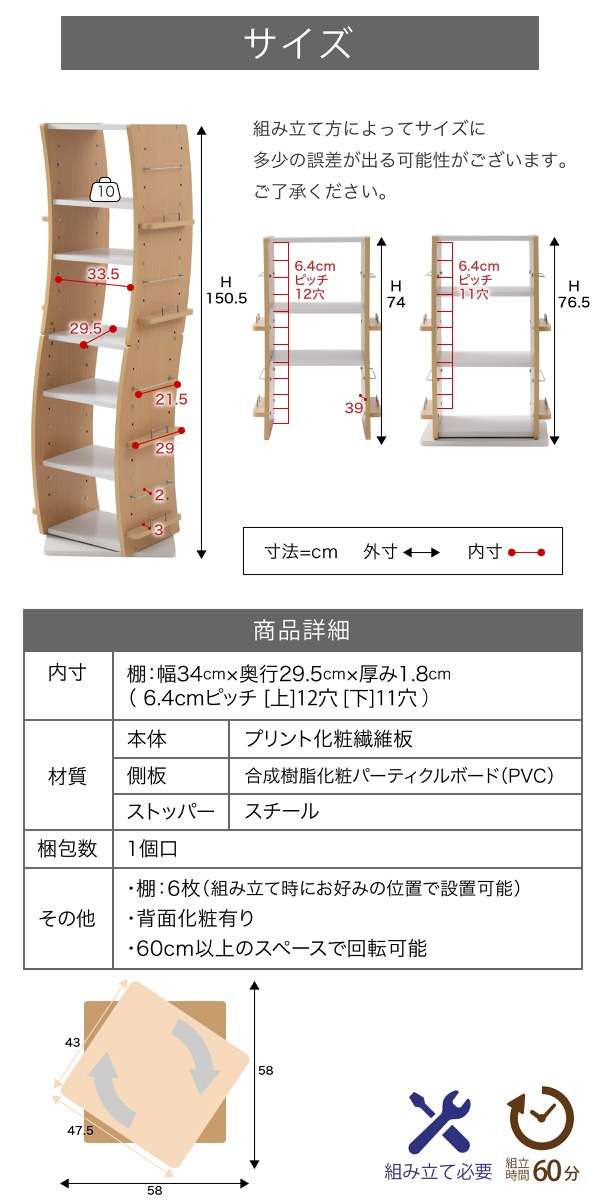 ■商品説明 360度自由に回転するラックはどの方向からでも本や小物を取り出せるのが便利。天板も含めて全ての棚が可動式だから、収納物にあわせて細かく微調整が可能です。また、分割して横に並べることでロータイプのラックとして使用してもOK。お部屋の空間や好みに合わせて自由にレイアウトできます。自由な機能と、特徴的なウェービーな側板デザインが上手く融合し、機能性とデザイン性を高次元で両立しました。