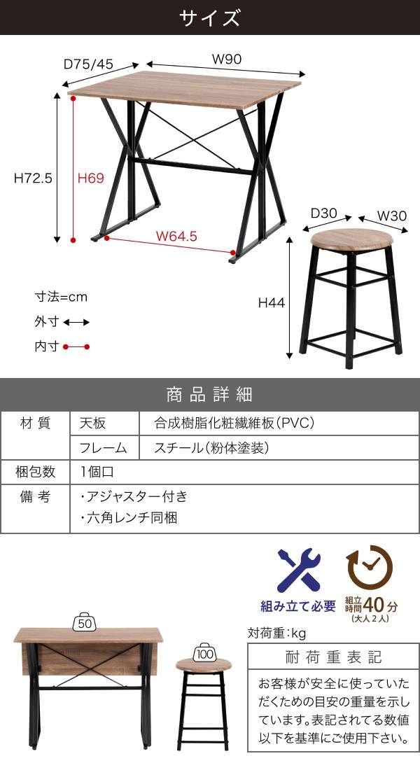 ◇シーンに合わせて天板サイズを変更できるダイニングテーブルにイス2脚が付いたダイニング3点セット。