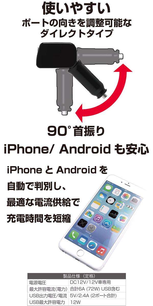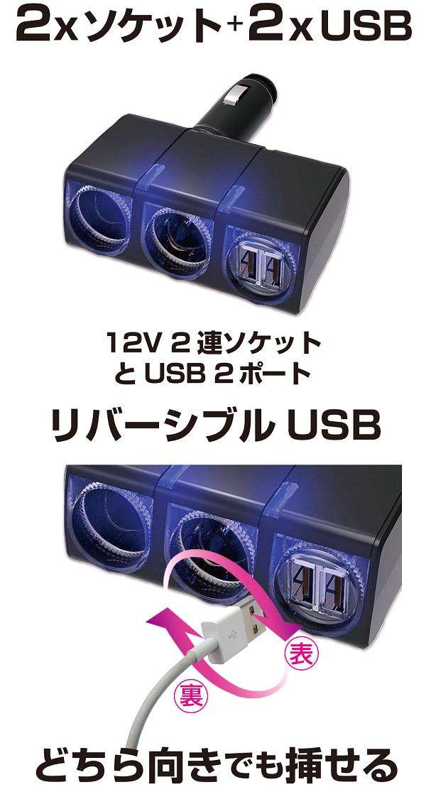 12Vの2連ソケットと5V/2.4A(合計最大)をUSB2ポートに分配