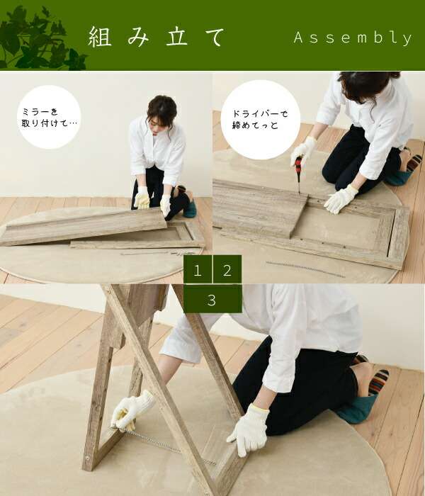 古木風シートが小物や観葉植物を際立たせるスタンドミラー