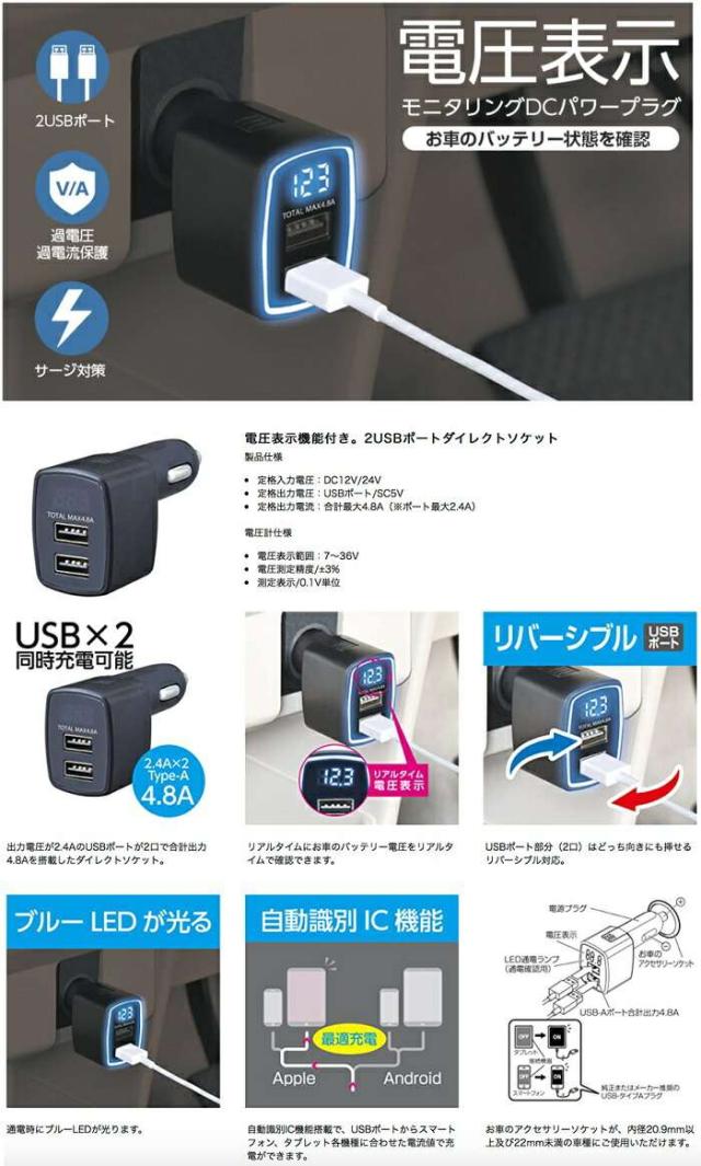 ※リバーシブルUSBポート/出力2.4A×2口/端末自動識別IC。