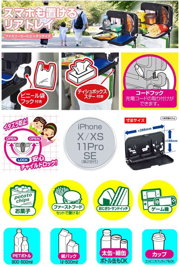 ●スマートフォンを縦置きと横置きでそれぞれ収納できるポケットが付いたリアトレイです。
