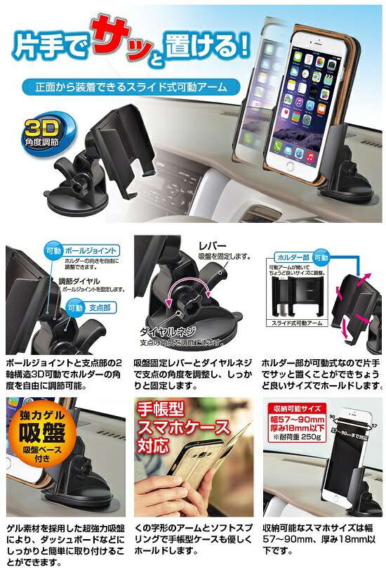 ●サッと入れられるスライド式可動アームにより片手で手帳型ケースを装着したスマートフォンを簡単に出し入れができます。