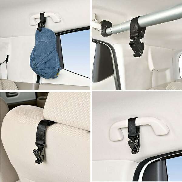 ●取り付けフックでヘッドレストシャフトにひっかけたり、アシストグリップ等にまきつけても使用できます。