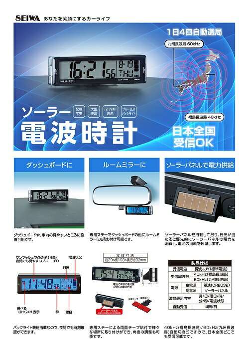 セイワ SEIWA KCMオンラインショップ カー用品 車用 カーアクセサリー カーインテリア 車内 車内アクセサリー 車内インテリア カー用 車内 車載 車載用 時計 クロック 電圧 サーモ 気温 外気温 温度 電波 電波時計 センサー 自動選局 車内温度