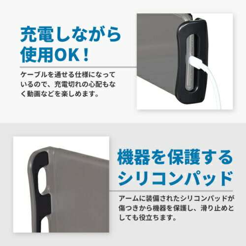●左右のアームがスライド伸縮しモバイル機器を挟んで固定します。