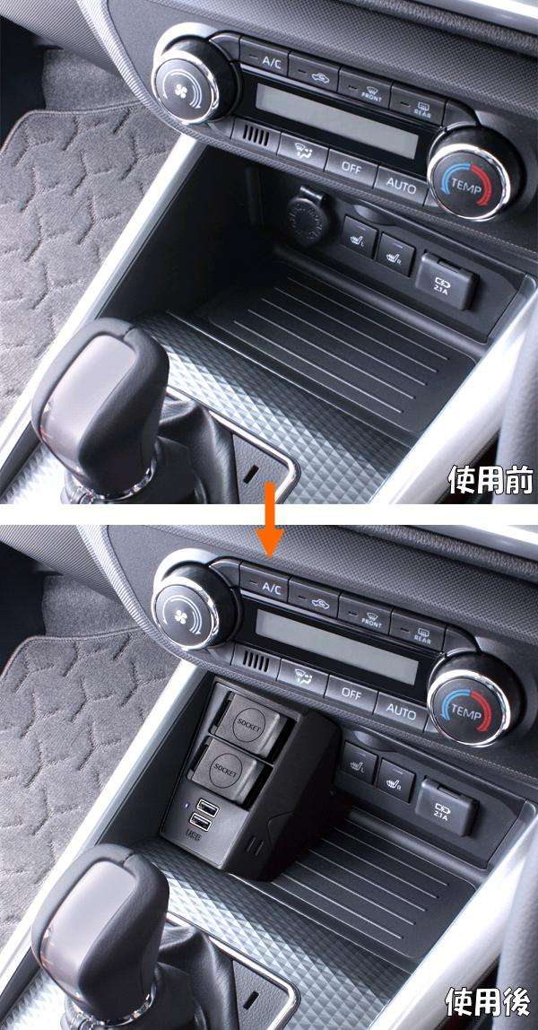 ●ライズ・ロッキー(A200/A210系)の右ハンドル車のフロントコンソールに取り付けできる電源ボックス。