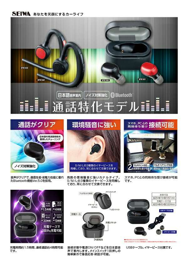 BTE180 Bluetooth ワイヤレス イヤホン マイク セイワ SEIWA BTE-180