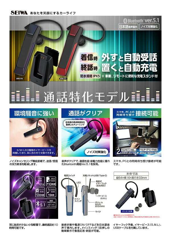 BTE170 Bluetooth ワイヤレス イヤホン マイク セイワ SEIWA BTE-170