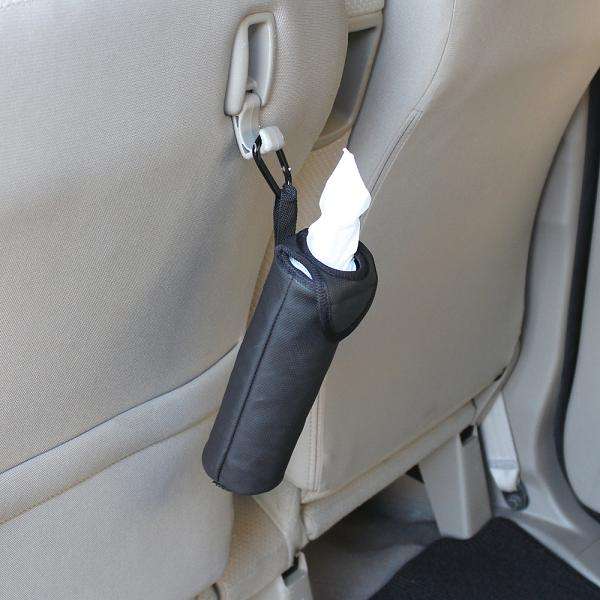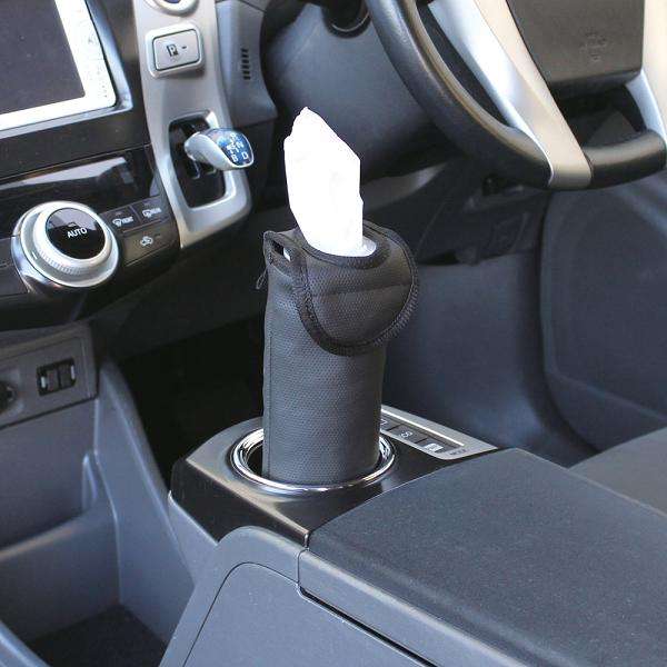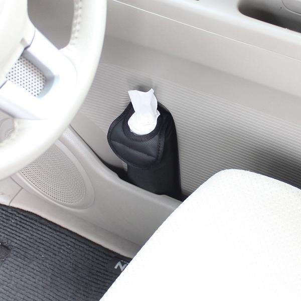 ◇ドアポケットのドリンクホルダーに入れてマジックテープで固定するソフトタイプのティッシュケース。