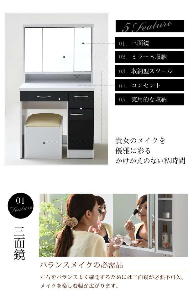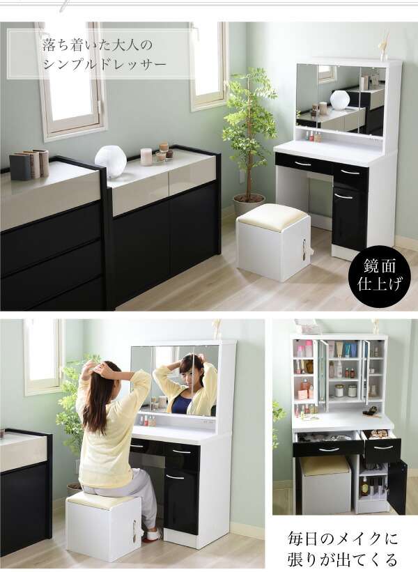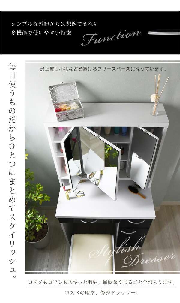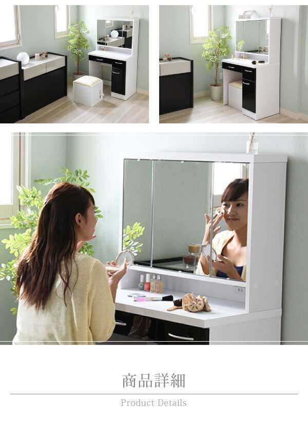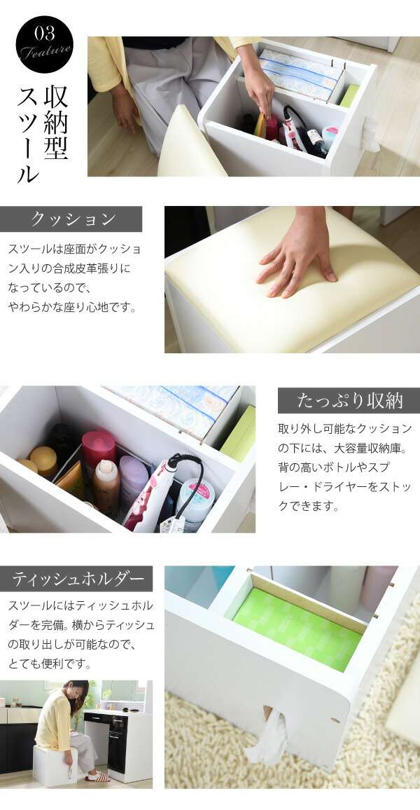 ◇ミラーの中もたっぷり収納でき、また少し開いた状態で使用すると三面鏡の役目も果たすドレッサーです。◇メイク時に欠かせないティッシュボックスもスツールの中に収納できとっても便利です。