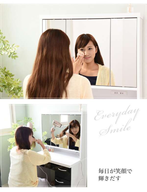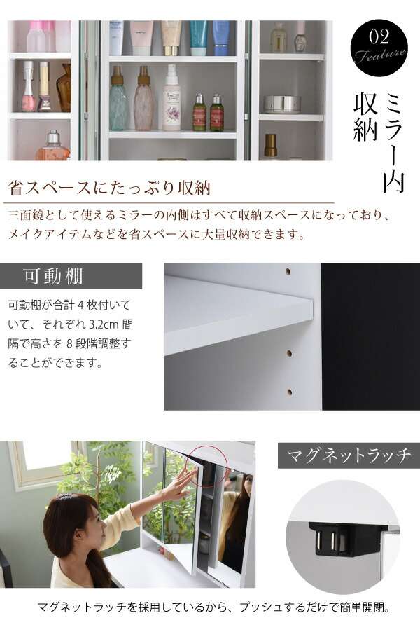 ミラーの中もたっぷり収納でき、また少し開いた状態で使用すると三面鏡の役目も果たすドレッサーです。