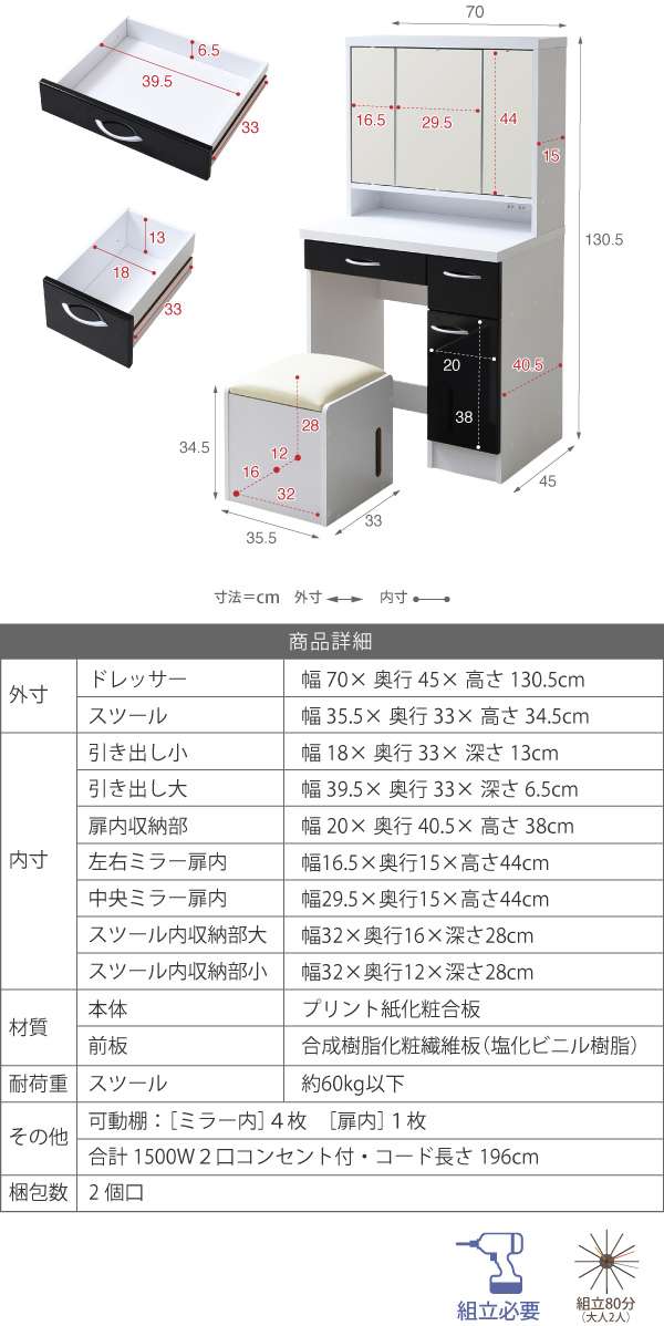 三面鏡 ドレッサー 鏡面仕上げ コンセント付き 幅70 隠し収納庫付 椅子 付き メイク ドレッサー 収納 メイク台 鏡台 3面鏡 化粧台 スツール 付き 姫 ホワイト 白