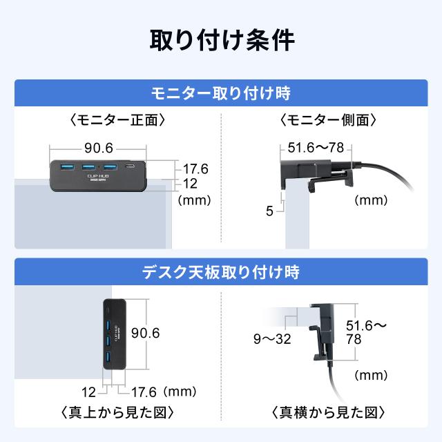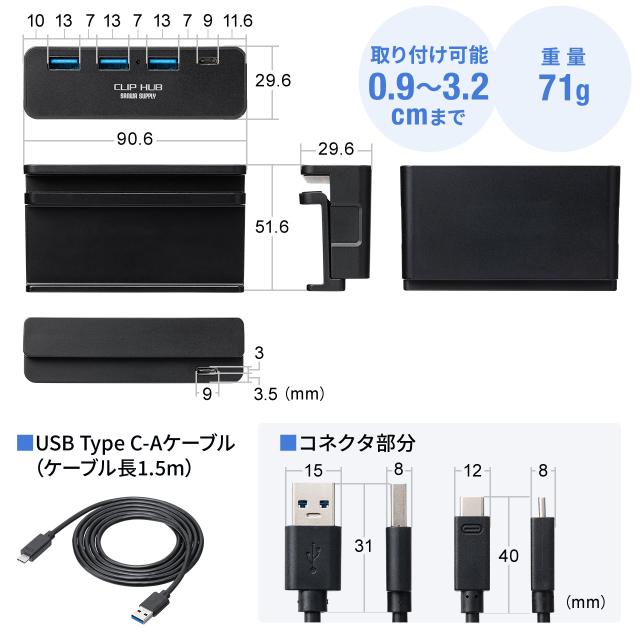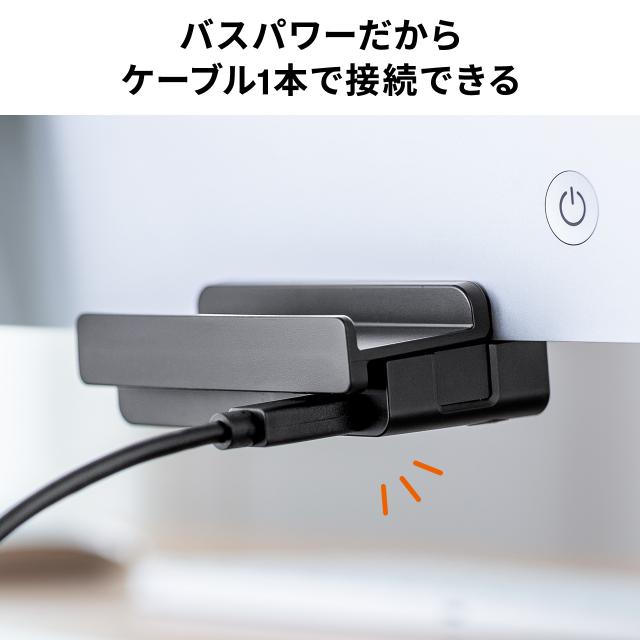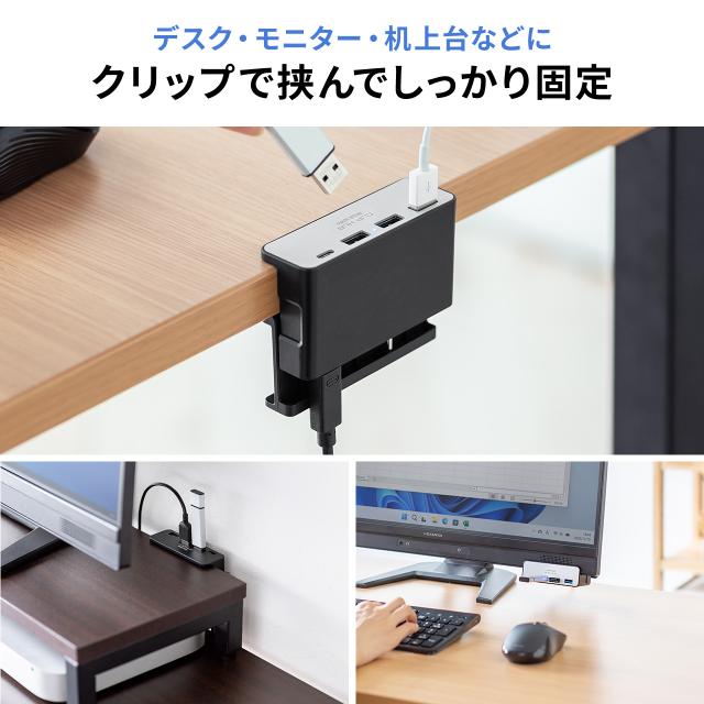 ⇒ご購入の前にご確認下さいバネ内蔵クリップで机やモニターに挟んで設置できる、USB-A接続のUSB3.2Gen1ハブ。USB A×3、Type-Cポート×1搭載でケーブル長1.5mのUSBハブ。ブラック。【WEB限定商品】
