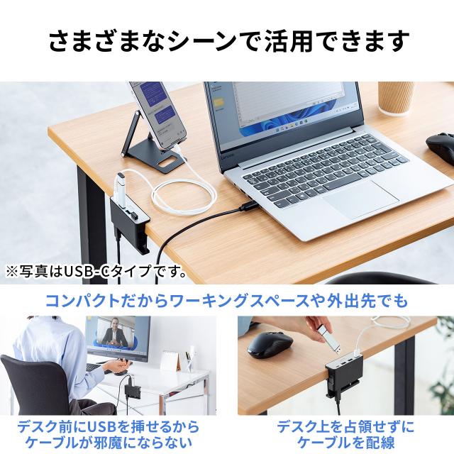 USBハブ クランプ固定 机固定 1.5mケーブルType-C対応 4ポート ブラック シルバー[400-HUBA065N]