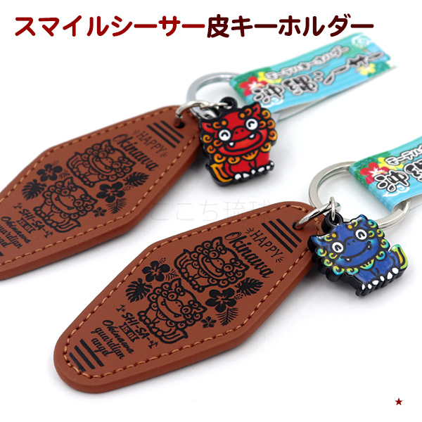 スマイルシーサー皮キーホルダー(ひし形) / 2カラー 沖縄お土産 雑貨 【M便】
