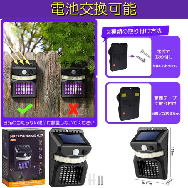 【多機能センサーライト】照明効果だけではなく、電撃殺虫器としても使えるセンサーライトです。16個LEDライトが搭載し、明るさは抜群で、バルコニー、廊下、パティオ、庭園、階段、外壁、ガレージ、歩道に明るく安全な環境を作り出し、より多くの照明エリアを提供して、停電、地震、台風など災害時、アウトドアシーンや緊急時まで、様々な場面でも活躍して優れるものです。光で虫を引き寄せ、電撃ショックで瞬間時に殺虫もできます。蚊・ハエなどを駆除し、快適にお過ごしいただけます。【ソーラー充電式&自動点灯・消灯】センサーライトはソーラーで充電:太陽光の光をエネルギーに変えて使用する仕組みになっていて完全に太陽光発電の為、電気代0、CO2排出0!電気代に負担なく環境に優しいです!光センサーを採用しており暗くなったら自動で点灯し、明るくなると消灯します。毎日のスイッチON・OFFの手間がかかりません。