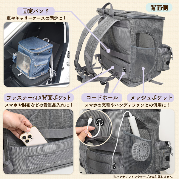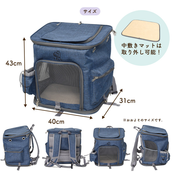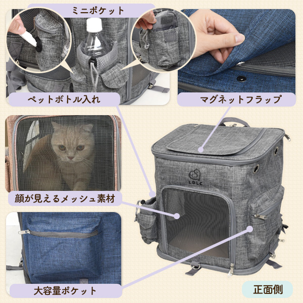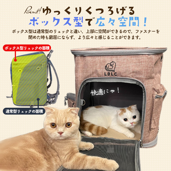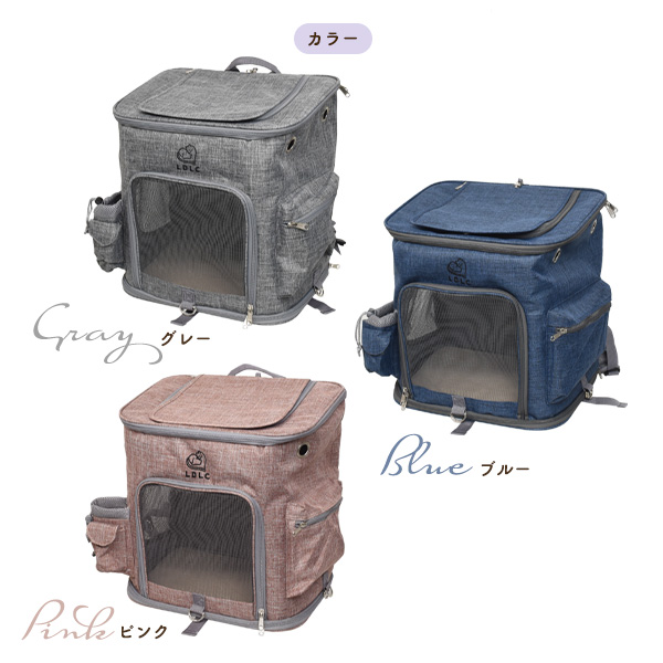 ボックス型は通常型のリュックと違い、上部に空間ができるので、 ファスナーを閉めた時も窮屈にならず、より広々と感じることができ、 移動時間もより快適に過ごしてもらうことができます。 天面と前面ファスナー式で全開にできるので、キャリーが苦手な子も入りやすくなっていて、 ペットの重みにも耐えられるように、底面部分にベルトが付いています。 背面やショルダー部分はクッション性が高く、長時間背負っても疲れにくくなっています。 またリュックが肩から落ちないようしっかり固定できる、 ワンタッチバックル式のベルトもついています。 車やキャリーケースを固定できるバンドや、ペットボトル入れなどの 収納ポケットも付いて、使い勝手も抜群です。 グレー、ブルー、ピンクの3色からお選び頂けます。 | ||||||||||||