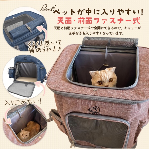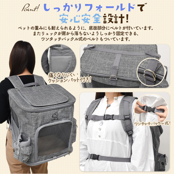 ペットと一緒のおでかけに便利な、折りたたみ式のペットキャリーリュック。背面やショルダー部分はクッション性が高く、長時間背負っても疲れにくくなっています。
