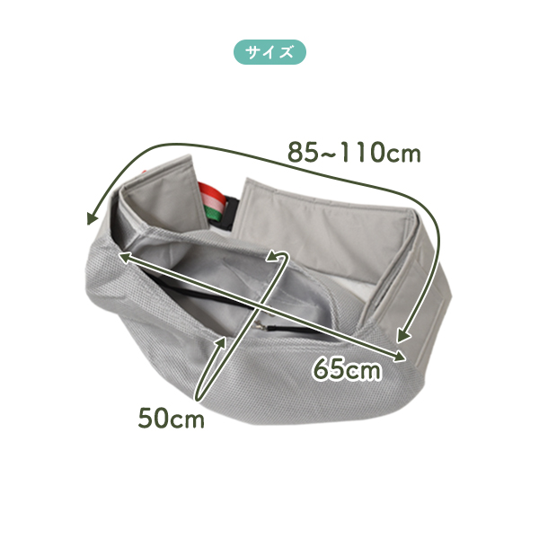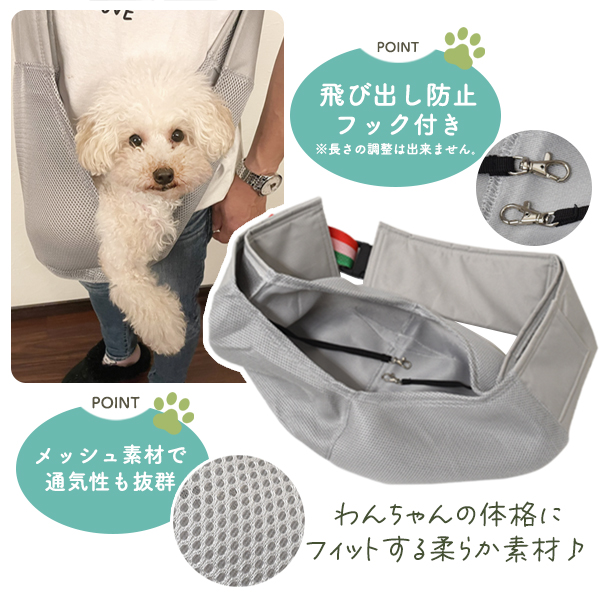 飼い主さんとの密着度が高く、安心感があるので、 パピーや人が多い場所が苦手な子にもぴったりです。 ペットにぴったりフィットする柔らか素材で、メッシュになっていて通気性も抜群です。 しっかり留まるワンタッチバックルで、飛び出し防止フックも付いていて安心安全! 肩にあたる部分の幅が広く、痛くなりにくい仕様になっています。 使わない時は折りたたんでコンパクトに収納でき、持ち運びにも便利です。 | ||||||||||||