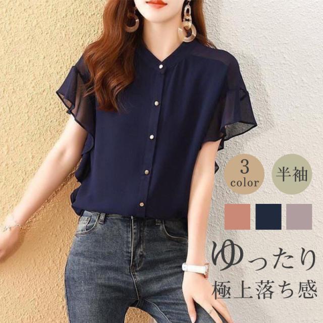 セール ブラウス 半袖 レディース シャツ トップス 切替 カットソー フリル 流行り 通勤 春夏 Tシャツ 柔らかい チュニック
