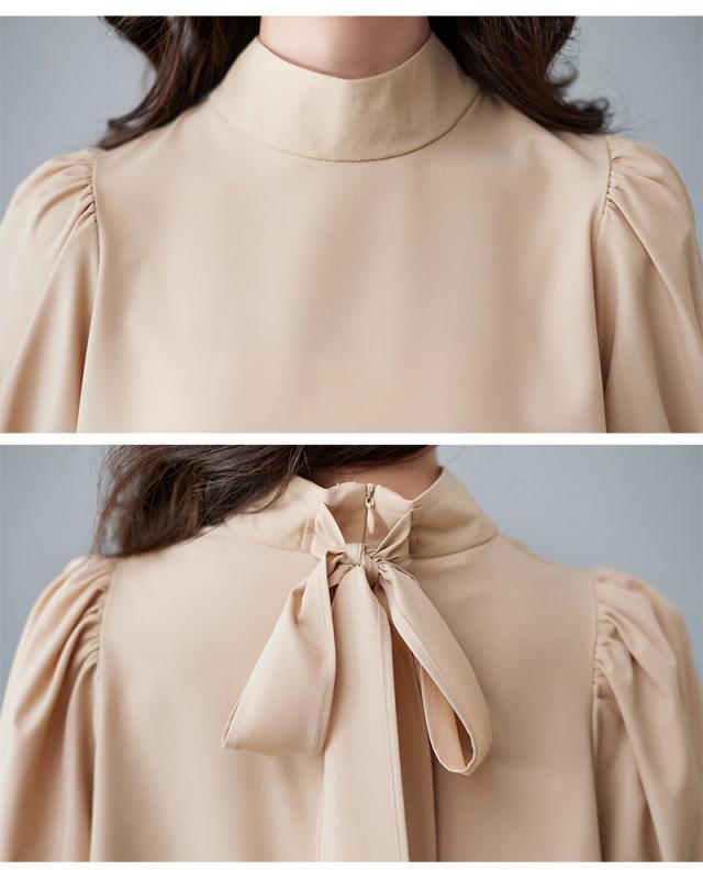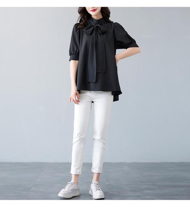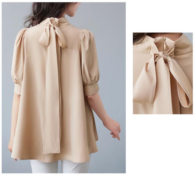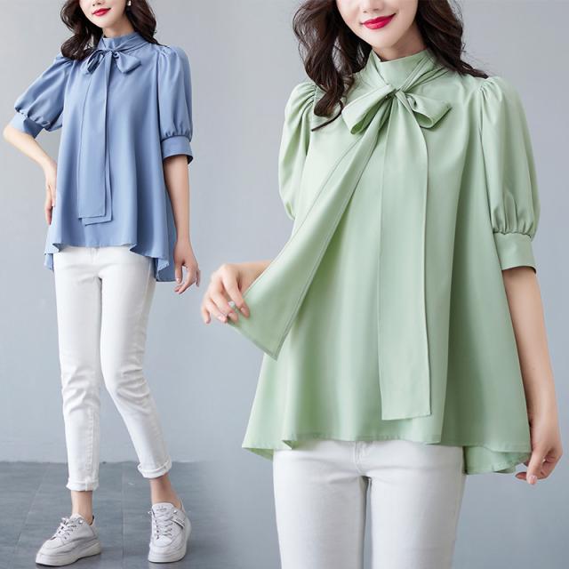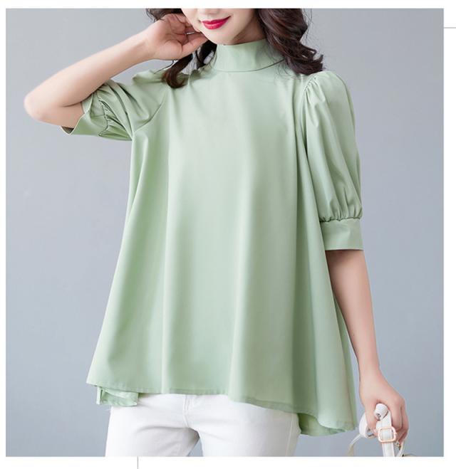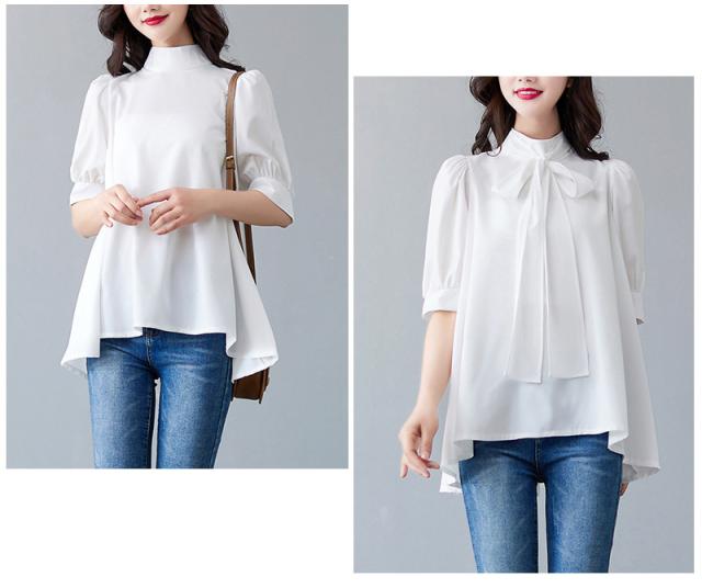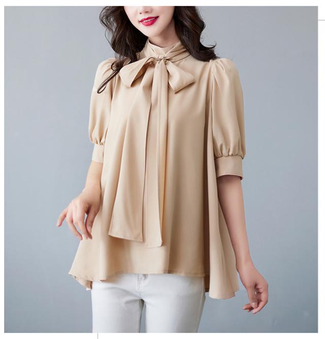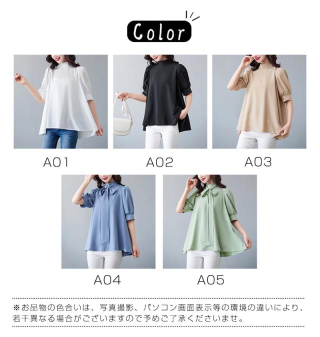 激安 ブラウス 半袖 レディース シャツ トップス おしゃれ カットソー ぽわん袖 ハイネック Tシャツ リボン付き チュニック