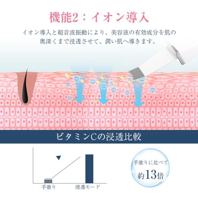 モード2イオン導入:マイナスイオンの力で、美容液の有効成分を肌の奥深くまで浸透させて、潤い肌へ導きます。